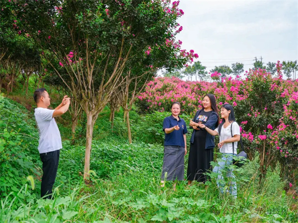 主持人王銳:“我現(xiàn)在所處的位置是光山縣司馬光油茶園里的川紅紫薇園,在蔚藍(lán)的天空下,千畝紫薇花正競(jìng)相開放,形成了一片壯觀的紅色海洋,吸引了不少游客前來打卡拍照,快跟我一起去看看吧!”