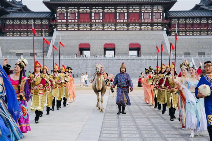 今年7月,在隋唐洛陽城國家遺址公園應天門遺址博物館(簡稱應天門)北廣場,身穿圓領袍、頭戴胡帽的“胡人”,牽著一頭駱駝,從應天門緩步走向明堂天堂。“這是真駱駝!”“我是在電視劇的拍攝現(xiàn)場嗎,這場景仿佛穿越了一樣。”看到“駝鈴陣陣”的現(xiàn)場版,不少游客驚嘆不已,紛紛上前合影留念。