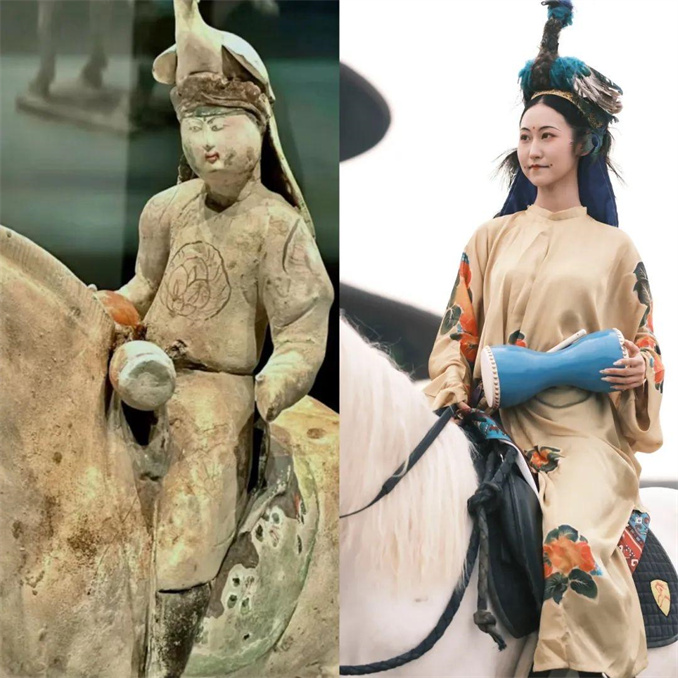 同在應天門北廣場的,還有一位頭戴孔雀冠的女子,她騎乘在馬上,手拿鼓槌敲擊小鼓十分引人矚目,這是對文物孔雀冠女俑的復原。據(jù)介紹,該文物出土自唐朝開國皇帝李淵的孫女,滕王李元嬰第三女金鄉(xiāng)縣主的墓葬中。