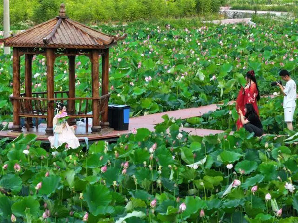 荒田變荷園,荷花扮靚了鄉(xiāng)村路。夏日,滿塘荷花肆意綻放,每年的6至8月,小小紅陽村吸引許多游客前來打卡賞荷。把熱度當(dāng)契機,拿流量當(dāng)存量。2023年,該鎮(zhèn)爭取項目資金對荷田進(jìn)行了配套設(shè)施建設(shè),新修了花磚步道、木棧橋、觀光亭、停車場、公廁等,為游客提升了觀賞體驗,荷田也變成了觀光園,縣域內(nèi)外網(wǎng)紅人員紛紛拍攝視頻,積極推薦其為夏日周邊出游的勝地。