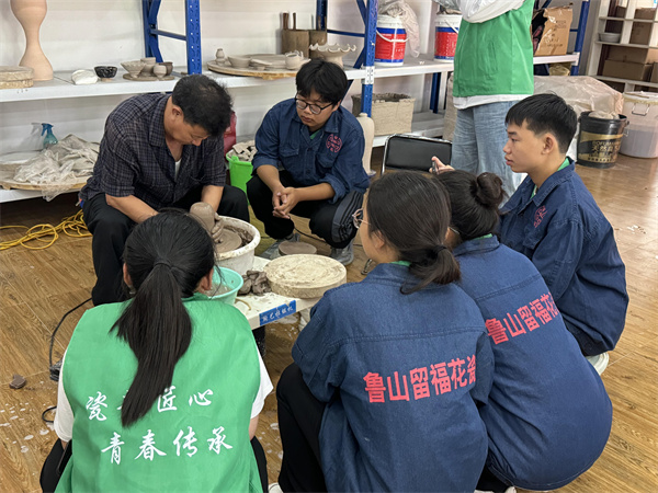 魯山花瓷燒制技藝傳承人、中國(guó)陶瓷藝術(shù)大師袁留福向?qū)W生們介紹了魯山花瓷的文化歷史、工藝流程、藝術(shù)特色。在魯山花瓷工坊式體驗(yàn)館,學(xué)生們認(rèn)真觀看花瓷制作過(guò)程、學(xué)習(xí)花瓷制作技藝。