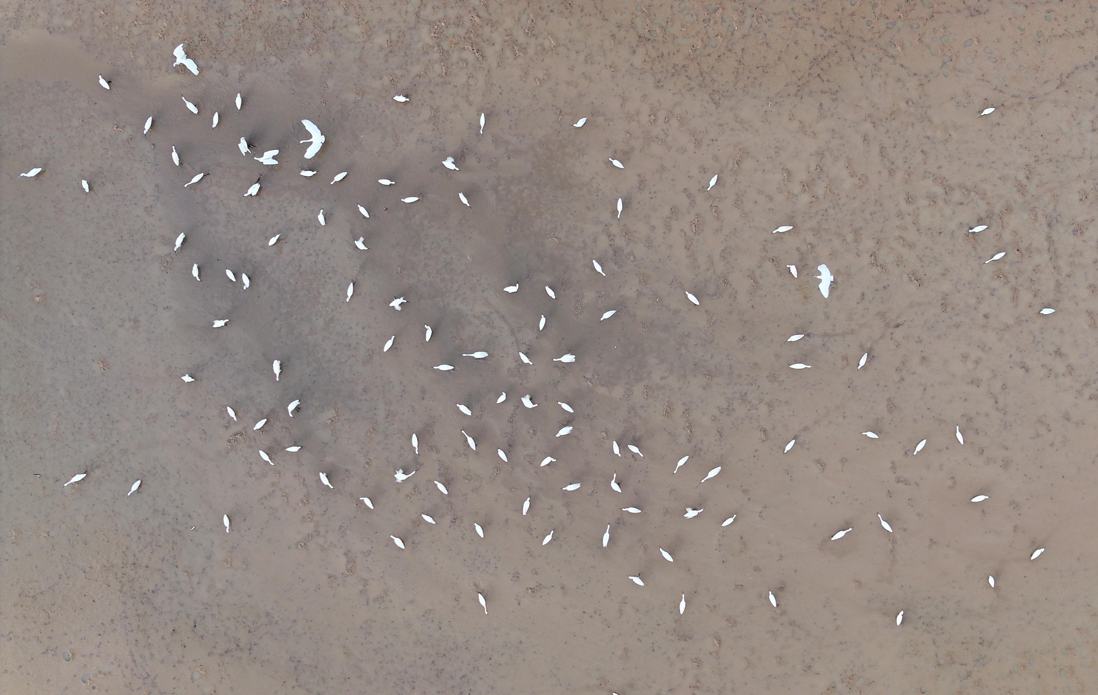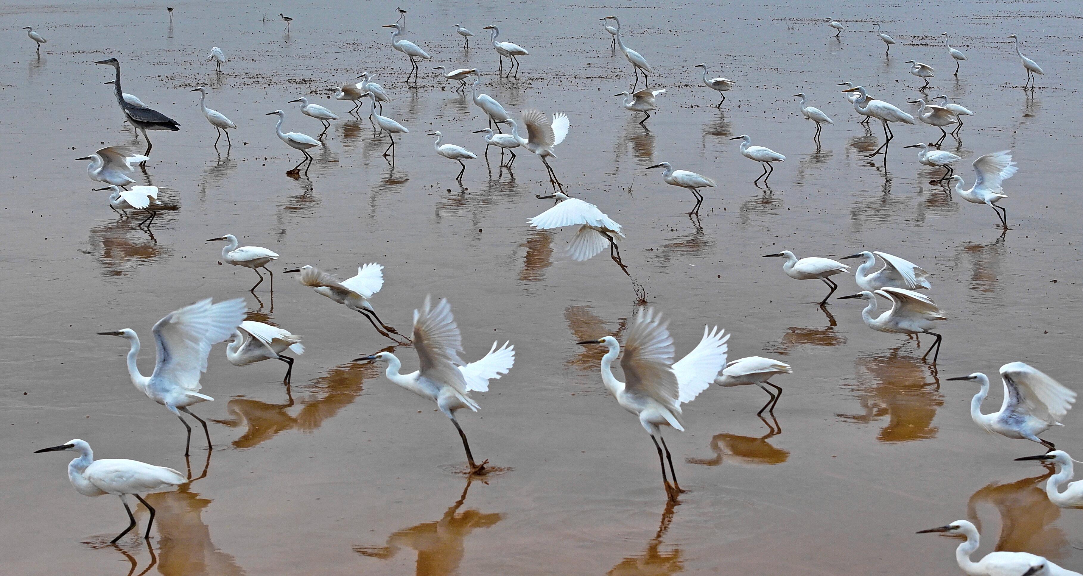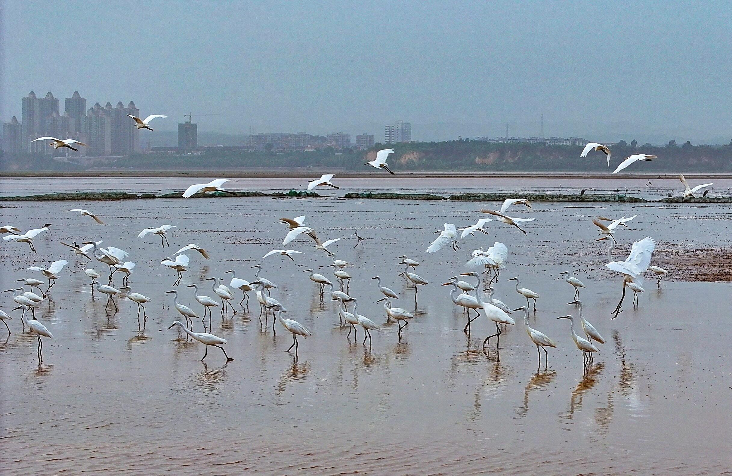 8月11日,在洛陽市孟津區(qū)西霞院水庫干涸的河床上,大批白鷺和其他鳥類在此覓食、嬉戲,構(gòu)成一幅美麗的生態(tài)畫卷,也成為市民休閑觀光的好去處。