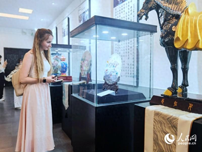 來自白俄羅斯的留學生喀秋莎駐足欣賞牡丹瓷。人民網記者 尚明楨 攝