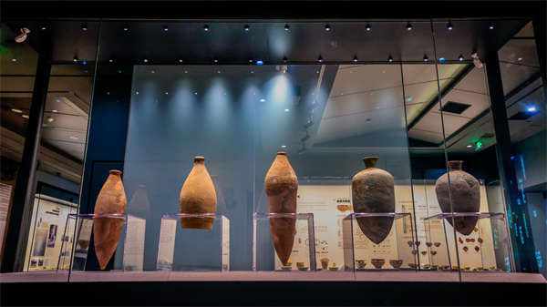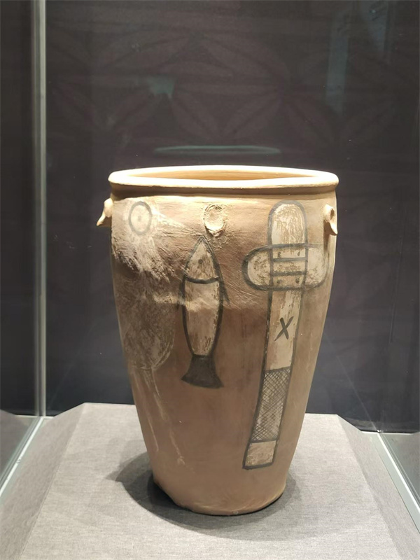 除了鸛魚(yú)石斧缸,在仰韶文化博物館,能代表“雛形”一意的文物不在少數(shù)。“陶器的發(fā)明是人類(lèi)文明發(fā)展進(jìn)程中極其重要的標(biāo)志,它是人類(lèi)歷史上首種人工材料,這件就是仰韶文化博物館的‘鎮(zhèn)館之寶’——小口尖底瓶,也是仰韶村遺址最具代表性的器物。”王琪向采訪團(tuán)介紹道,館內(nèi)展出了仰韶文化不同時(shí)期、不同地域最具代表性的彩陶花紋和造型,花瓣紋、魚(yú)紋、太陽(yáng)紋、幾何紋,彩陶盆、彩陶雙連壺、花瓣紋彩陶盆……一件件展品彰顯著中華文明的燦爛成就。