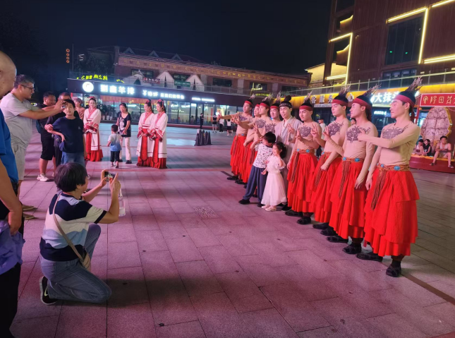夜晚演出結(jié)束后,演員們走出劇場,來到殷墟考古文旅小鎮(zhèn)街區(qū)中心,將近年來火熱的NPC互動玩法發(fā)揮到了極致,吸引不少游客合影留念。