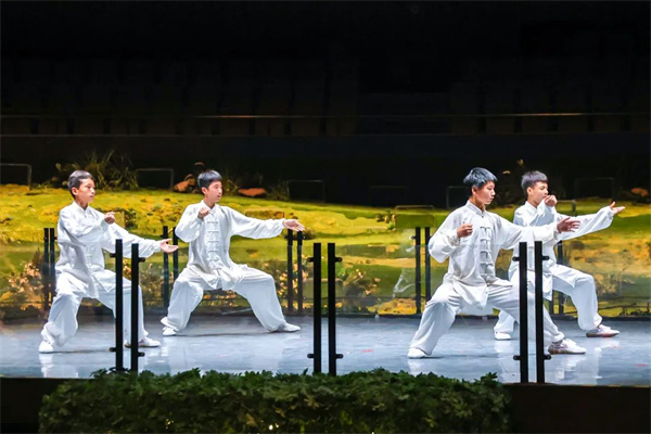 伴隨著扣人心扉的太極鼓樂,只見高臺(tái)上四位武者一招一式一氣呵成,或有招式轉(zhuǎn)換,也似筆斷意連,盡顯功夫魅力。舞臺(tái)充斥著水墨、留白元素等東方意境美,讓觀眾在動(dòng)靜之間感受太極文化。