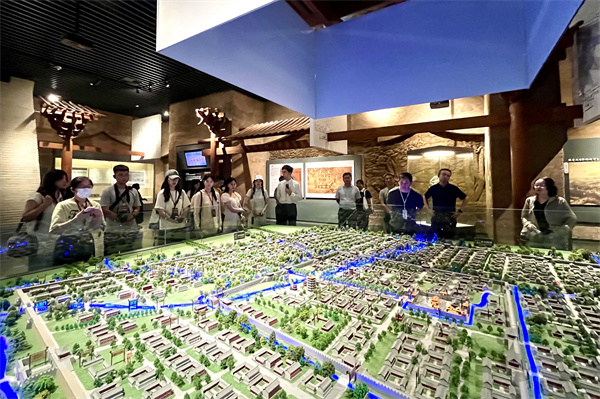 步入開封博物館“東京夢(mèng)華”展廳,一塊展示北宋東京城平面布局的沙盤吸引了采訪團(tuán)記者的圍觀。