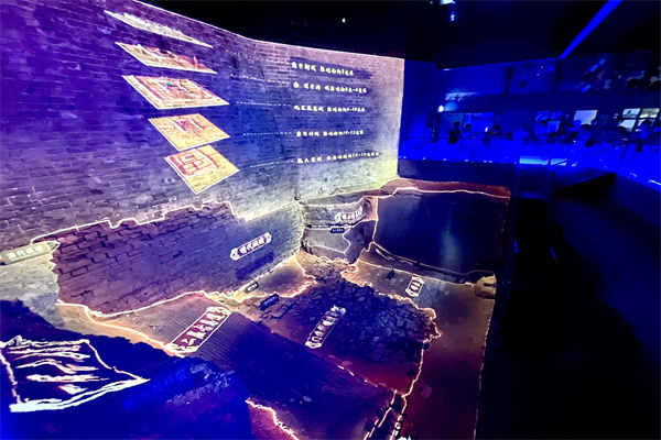據(jù)介紹,《古馬道》是在充分保護(hù)現(xiàn)有三層馬道的基礎(chǔ)上,聯(lián)合遺址立面和古跡地面,形成L型成像載體雙幕聯(lián)動(dòng),打造沉浸式實(shí)景數(shù)字沙盤,利用虛擬現(xiàn)實(shí)技術(shù),實(shí)現(xiàn)裸眼3D效果,讓游客站在遺址之上,直接觀看遺址全貌并了解其“前世今生”。
