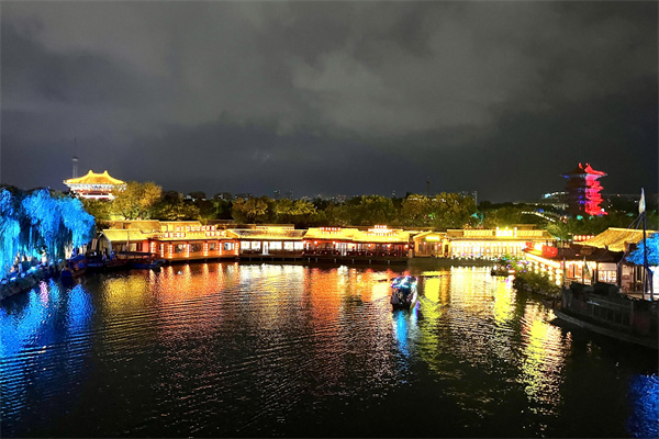 華燈初上,霓虹燈影,車水馬龍……夜幕下的開封清明上河園景區(qū),在璀璨的燈光中盡顯繁華,遍布全園的夢(mèng)幻花燈讓人們仿佛置身于千年前沒有宵禁的北宋東京城。