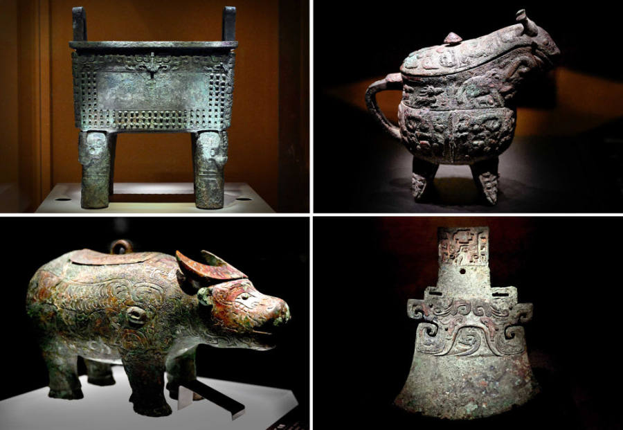 這是2024年2月23日拍攝的河南安陽殷墟博物館新館內(nèi)展出的“司母辛”銅鼎(左上)、“亞長”銅。ㄓ疑希“亞長”牛尊(左下)、“亞長”銅鉞(拼版照片)。新華社記者 李安攝