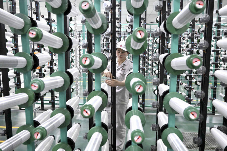 在位于河南安陽林州市的河南光遠新材料股份有限公司電子布準備車間,工作人員在檢查整經(jīng)機機臺(2024年2月22日攝)。該公司通過自主技術(shù)創(chuàng)新,攻克“卡脖子”技術(shù),研發(fā)出5G用低介電電子紗、5G用超薄電子布等產(chǎn)品。新華社記者 李安攝