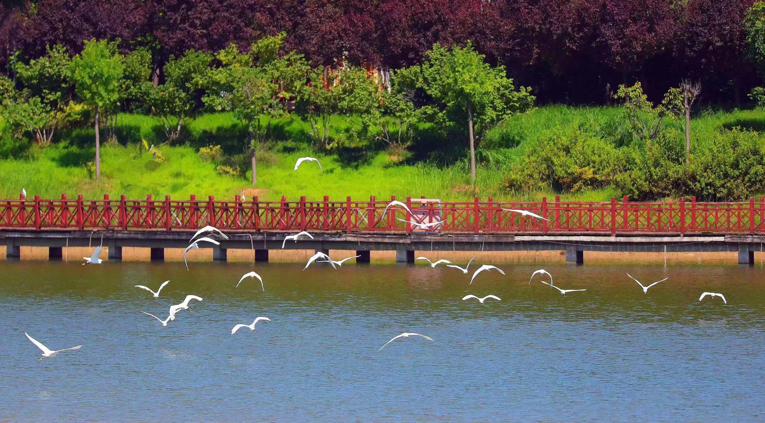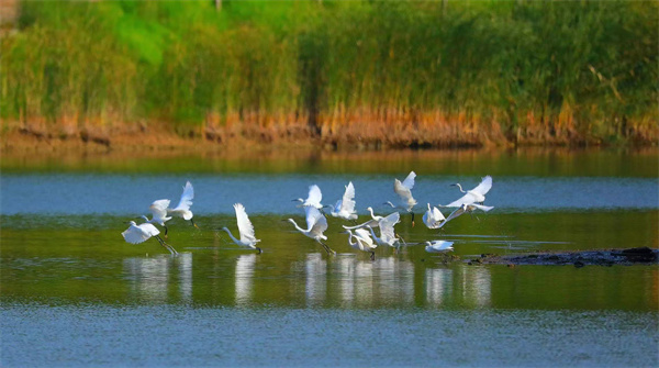 許昌“再見三國”景觀節(jié)點生態(tài)環(huán)境優(yōu)美, 連日來吸引不少白鷺等水鳥棲息覓食,白鷺,藍天,碧水,綠草,構(gòu)成了一幅美麗生態(tài)畫卷。