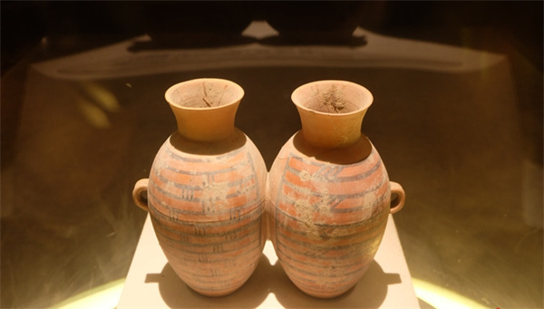大河村遺址博物館展出的彩陶雙連壺(復(fù)制品) 仝瑞勤 攝