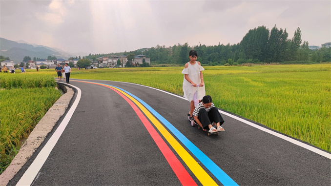 9月9日,在魯山縣趙村鎮(zhèn)小爾城村,綠黃相間的稻田加上剛剛修建的“彩虹路”,吸引不少人前來游玩。