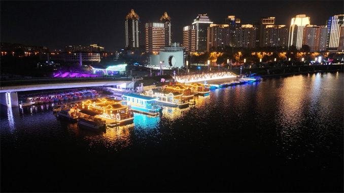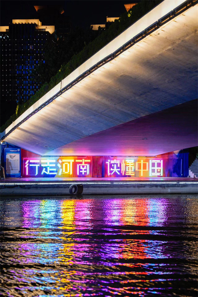 “星河欲轉(zhuǎn)千帆舞,燈火闌珊映水樓。”隨著游船緩緩駛離碼頭,一場視覺與心靈的雙重盛宴正式啟航。游船穿梭于如意河的蜿蜒水道,抵達東風(fēng)渠畔,沿途光影交錯,如同進入了一個夢幻般的童話世界。波光粼粼的水面映射著豫劇《掛帥》中穆桂英的颯爽英姿、百家姓彩燈的輝煌燦爛,兩岸風(fēng)景如畫,現(xiàn)代建筑的剛毅與古典元素的柔美交相輝映,構(gòu)成了一幅幅動人心魄的城市畫卷。