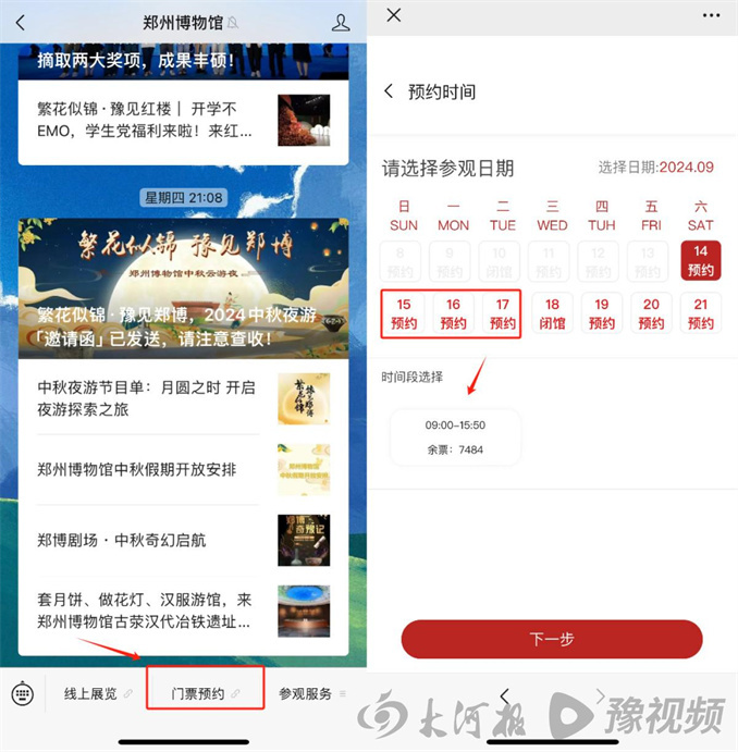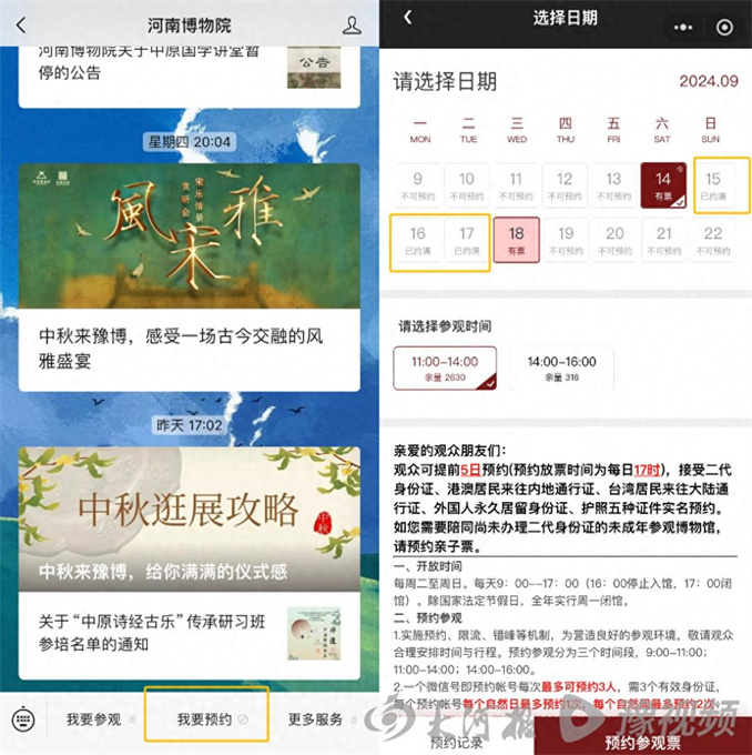 記者從河南博物院官方微信查詢顯示,9月15日至17日中秋假期期間的入館名額均已提前約滿,而9月18日假期后的首個工作日尚有余票可供預(yù)約。河南博物院提示觀眾,可提前5日通過其官方微信進行預(yù)約,預(yù)約放票時間為每日17時。