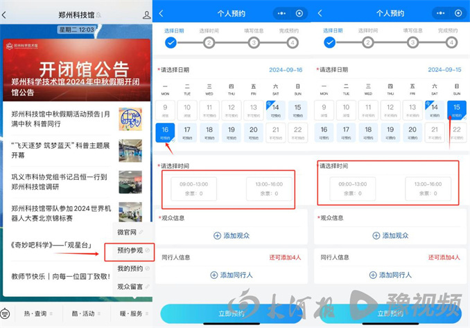 河南省科技館的中秋假期預(yù)約情況同樣緊張。記者查詢發(fā)現(xiàn),9月15日的門票已經(jīng)約滿,9月16日尚有少量余票,而9月17日的預(yù)約通道尚未開放,請市民朋友提前2天(每天09:00開始),通過河南省科技館官方微信進行預(yù)約。