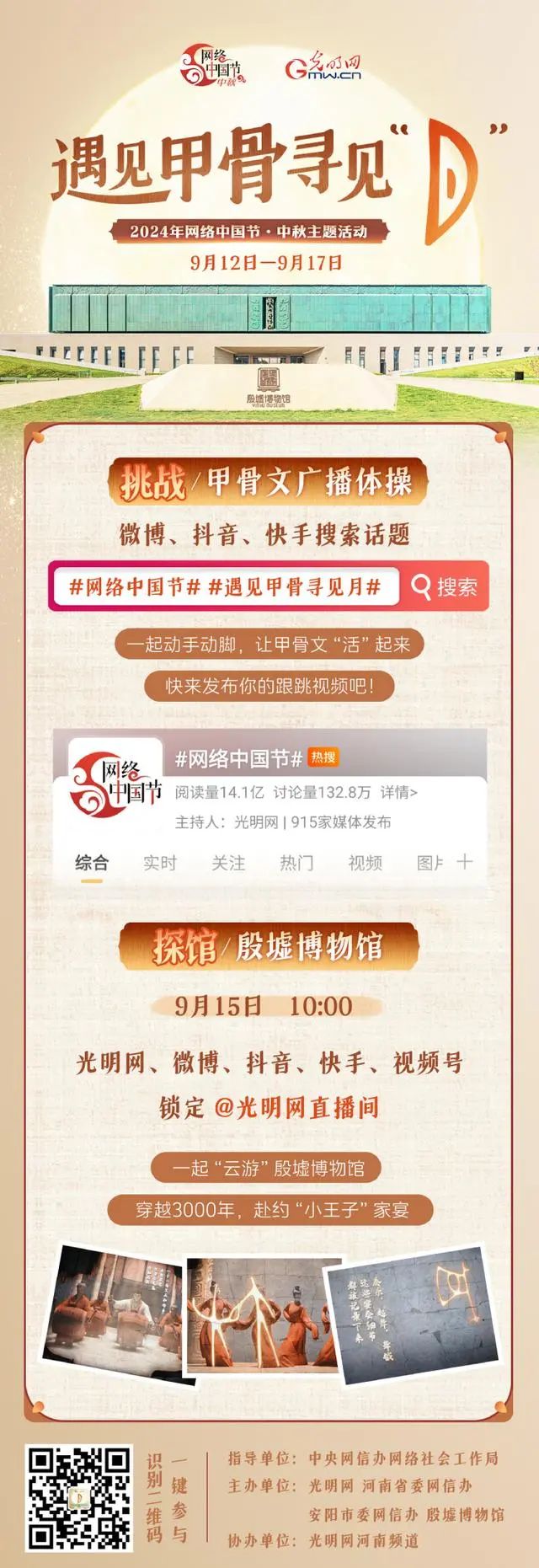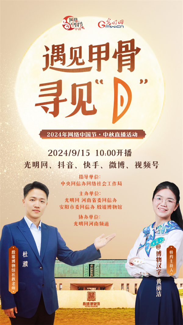 甲骨文是迄今為止中國(guó)發(fā)現(xiàn)的年代最早的成熟文字系統(tǒng),是漢字的源頭和中華優(yōu)秀傳統(tǒng)文化的根脈。2024年中秋節(jié)之際,在中央網(wǎng)信辦網(wǎng)絡(luò)社會(huì)工作局指導(dǎo)下,光明網(wǎng)聯(lián)合河南省委網(wǎng)信辦、安陽(yáng)市委網(wǎng)信辦、殷墟博物館共同開展2024網(wǎng)絡(luò)中國(guó)節(jié)“遇見(jiàn)甲骨尋見(jiàn)‘月’”中秋主題活動(dòng)。本活動(dòng)由光明網(wǎng)河南頻道協(xié)辦,并由微博、抖音、快手等互聯(lián)網(wǎng)平臺(tái)提供平臺(tái)支持。本次活動(dòng)將推出殷墟博物館探館直播、甲骨文廣播體操短視頻挑戰(zhàn)等精彩內(nèi)容,同時(shí)發(fā)起#遇見(jiàn)甲骨尋見(jiàn)月#話題互動(dòng),分享更多中秋習(xí)俗、甲骨文字等背后的文脈故事。
