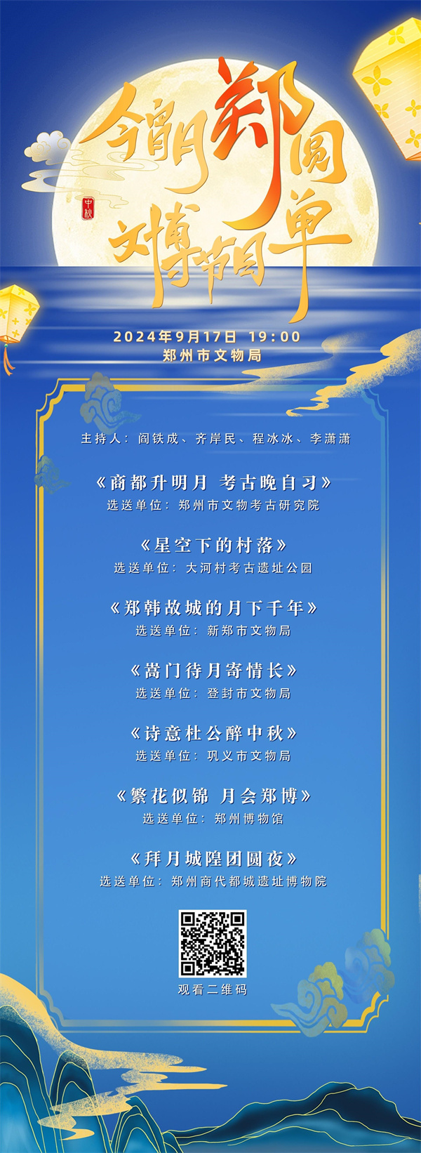 9月17日19:00,“今宵月‘鄭’圓”鄭州市文博特別節(jié)目,將正式上線。四位專家、學者和媒體達人將分別從城市考古課堂中甲骨文的“月”,到6000多年前大河村考古遺址公園的彩陶“月亮紋”;從 2700年前的鄭韓故城,到“嵩門待月”的盛景;從“月是故鄉(xiāng)明”詩句中的杜甫故里,到鄭州城隍廟的拜月儀式、鄭州博物館中秋奇妙夜......讓您在中秋之夜,共度傳統(tǒng)節(jié)日,與歷史對話,感受跨越時空的情感共鳴。