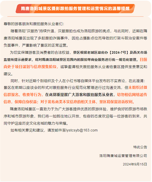 關(guān)于隋唐洛陽城景區(qū)攝影跟拍服務(wù)管理和運營情況的提醒!