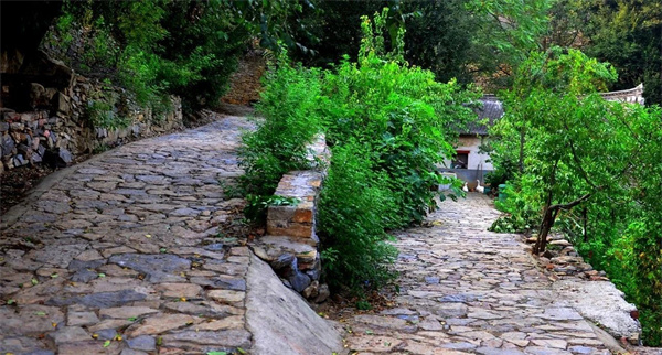 沿盤山公路緩緩前行,穿過石門,豁然開朗。平整寬闊的柏油路穿村而過,兩旁石墻、石階、石房子錯(cuò)落有致。涼蔭里,幾名游客穿著彩裙,不停地用相機(jī)“框住”美景。