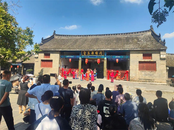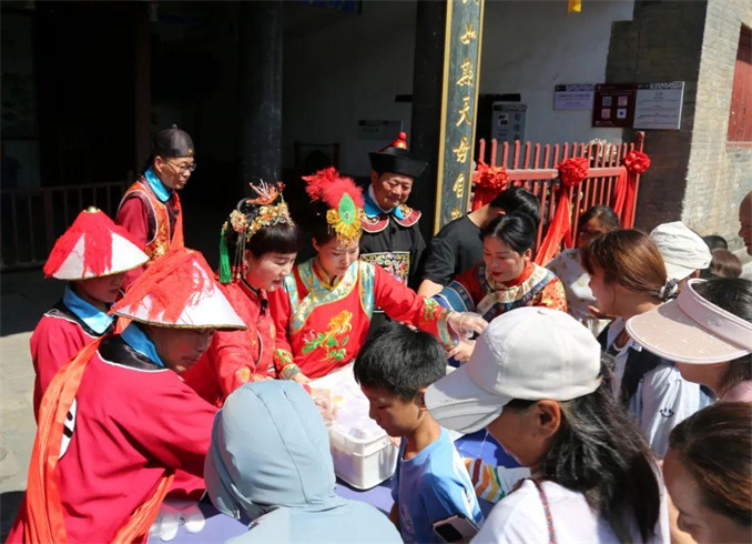 假日期間,廣大游客置身于700余年的古建筑群落,觀展覽、看演藝、賞宛梆、嘗月餅,沉浸式體驗(yàn)到了內(nèi)鄉(xiāng)縣衙的古風(fēng)古韻。內(nèi)鄉(xiāng)縣衙推出的《知縣審案》《知縣出巡》《知縣招婿》《品茶聽?wèi)颉返染始姵恃菟嚬?jié)目,讓廣大游客體驗(yàn)到節(jié)日的喜慶與歡樂。 特別是9月17日(八月十五)上午,內(nèi)鄉(xiāng)縣衙與七若滋烘焙坊聯(lián)合舉辦“中秋免費(fèi)嘗月餅送祝福”活動(dòng),內(nèi)鄉(xiāng)縣衙“知縣”率眾“衙役”在大堂發(fā)放月餅,為廣大游客送上節(jié)日美好的祝福。