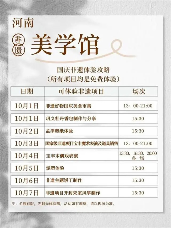非遺體驗惠民活動豐富多彩,每天主題不同,免費體驗。游客只需提前在“河南非遺美學(xué)館”小紅書官方賬號或到館現(xiàn)場預(yù)約即可(注意:名額有限,報滿截止)。