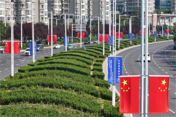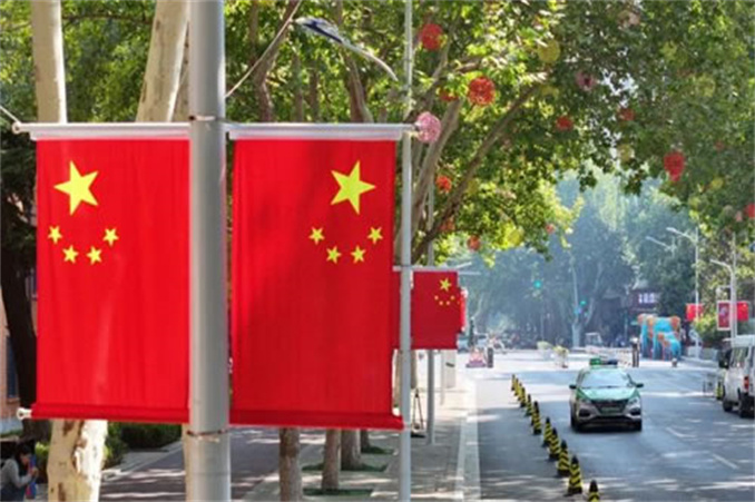 在藍(lán)天白云的襯托下,五星紅旗迎風(fēng)飄揚(yáng),把街頭巷尾裝扮得明艷靚麗,將節(jié)日氛圍渲染得格外濃烈,滿城涌動(dòng)著深深愛國情。