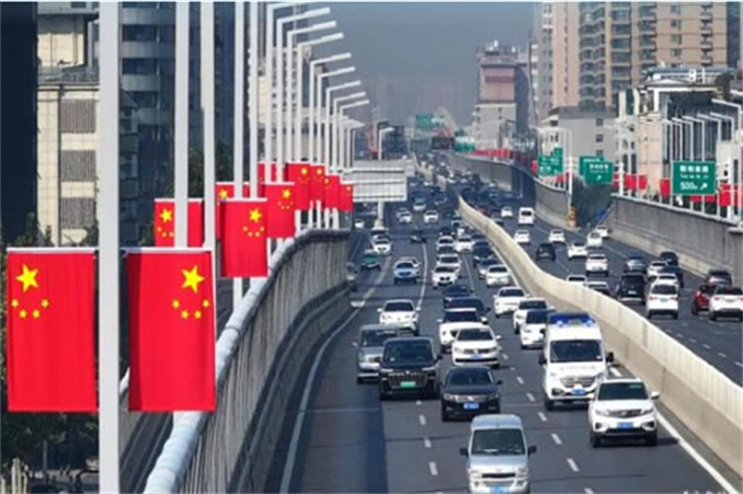 車水馬龍之上,大街小巷之間,無處不在的五星紅旗迎風(fēng)飄揚(yáng),映襯出幸福生活最紅火的底色,繪就出國慶節(jié)最靚麗的風(fēng)景線。