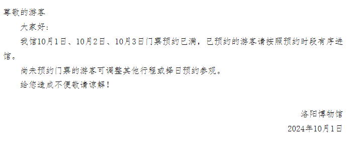 洛陽(yáng)博物館關(guān)于10月1日、10月2日、10月3日預(yù)約已滿的提示