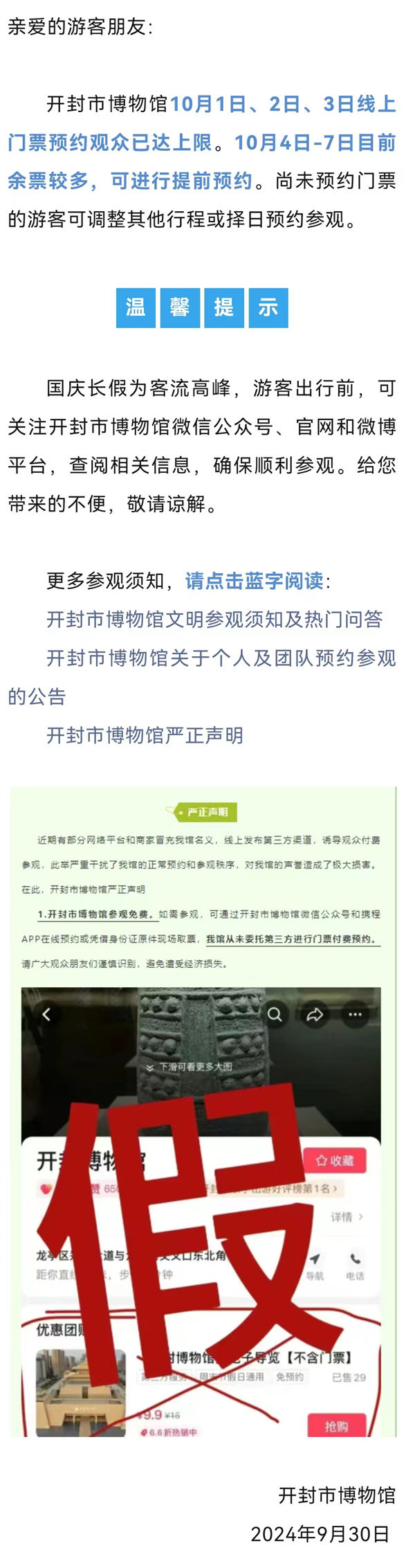 開封市博物館關(guān)于10月1日、2日、3日門票預(yù)約情況的提示