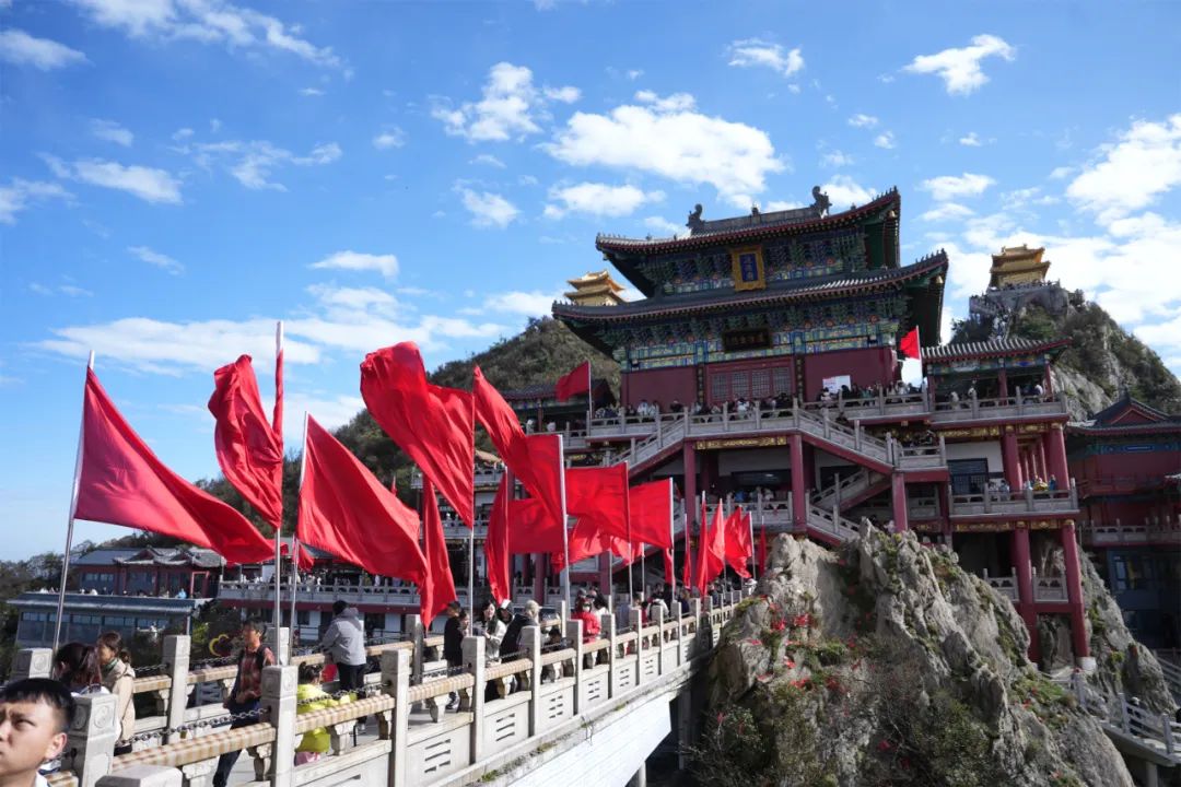 此時(shí)的老君山景色,可以用“如畫”二字來形容。國(guó)慶假期,鮮艷的紅旗、蒼翠的松柏、碧藍(lán)的天空相映成趣。