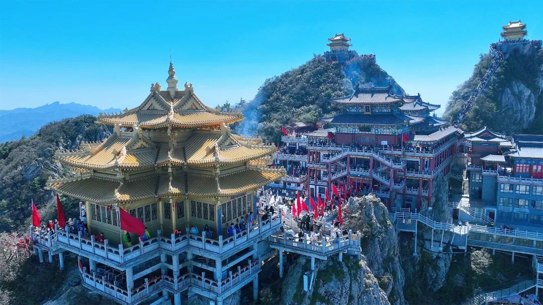 站在山頂,俯瞰群山連綿,藍(lán)天白云下的金殿仿佛云上仙宮,美得讓人心曠神怡!