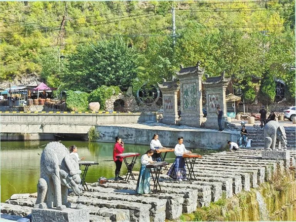 身著傳統(tǒng)服飾的古箏愛好者,在濟(jì)源南山產(chǎn)業(yè)旅游路沿線的坡頭鎮(zhèn)清澗村進(jìn)行演奏。