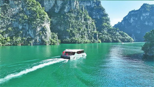 焦作修武縣峰林峽景區(qū)內(nèi),一艘游船載滿游客,穿行于碧水青山間。