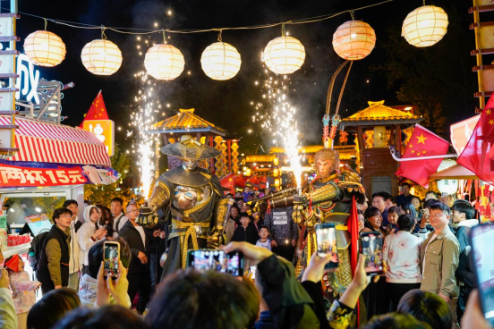 落日余暉,璀璨星河。彩燈下的嵩陽景區(qū),熠熠生輝,優(yōu)美的舞蹈、獨(dú)特的變臉、噴火表演,還有賣松客、飛天菩薩、黑神話-悟空、俠客機(jī)甲等NPC巡游,吸引眾多游客觀看互動(dòng)。其中,最為火爆的黑神話-悟空機(jī)甲更是吸粉無數(shù),引得無數(shù)小朋友爭(zhēng)相模仿。