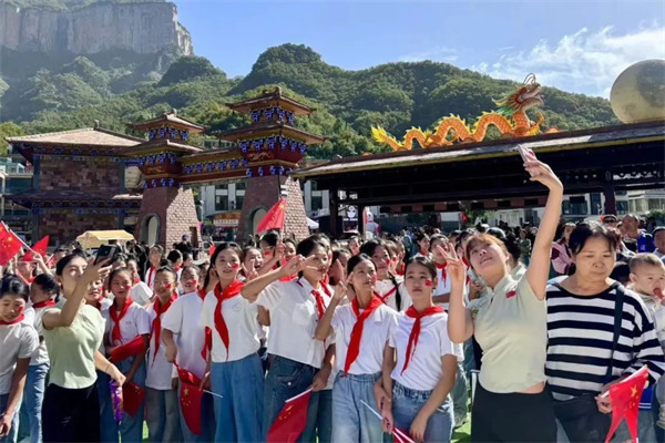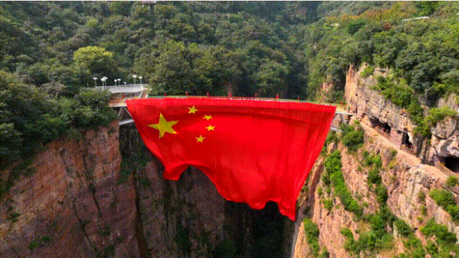 中午12時(shí),寶泉景區(qū)內(nèi)的躍云橋上一面長達(dá)60米的國旗緩緩展開,最美中國紅飄揚(yáng)在壯闊的太行山間,游客們紛紛揮動(dòng)手中的國旗,滿山的五星紅旗熠熠生輝,將整個(gè)景區(qū)的國慶氣氛推向高潮。