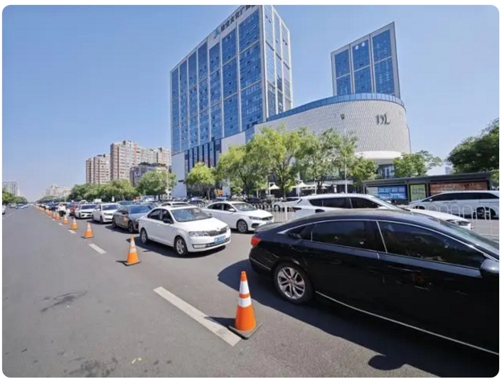 11時(shí)許,胖東來天使城西邊的八龍路上,排隊(duì)準(zhǔn)備進(jìn)入天使城停車場的車輛從八龍路與建安大道交會(huì)處延伸到了八龍路與八一東路交叉口,有將近500米,其中大部分車輛都懸掛著外地牌照。