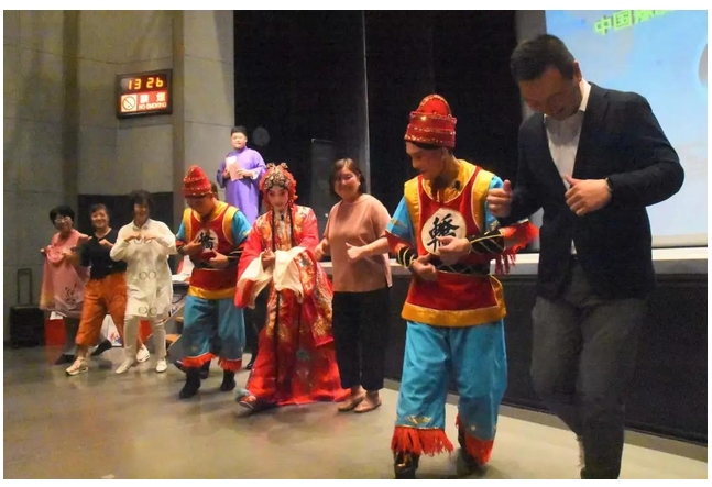 “府門外三聲炮花轎起動……”演出在青年演員白璐演唱的《抬花轎》選段中拉開帷幕。正如戲詞中所唱的那樣,現(xiàn)場氣氛“喜氣盈盈”?戳恕短ЩㄞI》還不過癮,觀眾還走上前臺,學習抬花轎的動作,感受坐轎人的喜悅,將現(xiàn)場氣氛推向了小高潮。