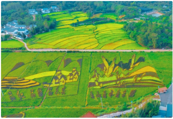 據(jù)了解,高寨村用不同水稻品種培育出多彩水稻,將稻田、山水與珍稀朱鹮巧妙融合,栽種出形態(tài)各異、色彩斑斕的稻田畫,繪就多彩“豐收圖”,成為觀光農(nóng)業(yè)獨特景觀。