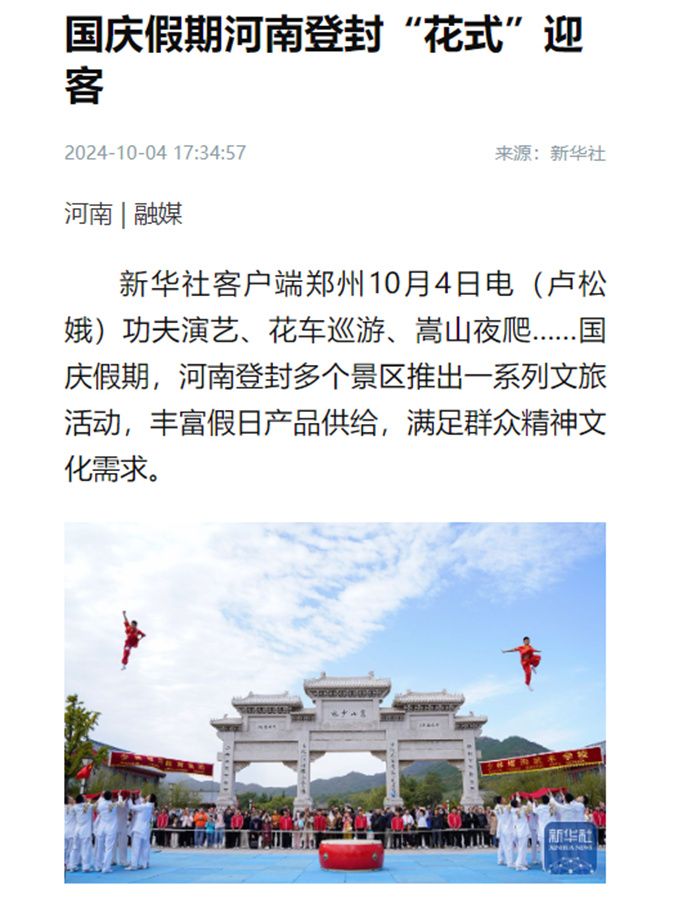 新華社也以《河南鄭州登封“花式”迎客》為題,報道了嵩山少林景區(qū)的功夫演藝、花車巡游、嵩山夜爬、嵩山美食等系列活動。