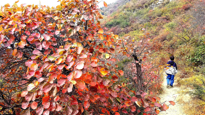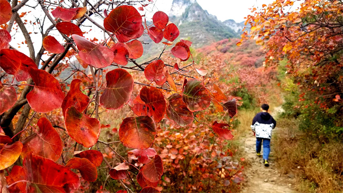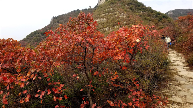 連日來,太行山濟(jì)源段迎來紅葉最佳觀賞期。太行山高低錯落,雄偉壯觀,森林覆蓋率高,山上分布的黃櫨、五角楓、柿樹等不同樹種的樹葉在大自然的作用下由黃變紅,滿山層林盡染,濃墨重彩,冷暖色調(diào)交相輝映,甚至整座山峰都被紅葉覆蓋,吸引了不少游人前往觀賞。圖為游人在濟(jì)源克井鎮(zhèn)交地古道上觀賞紅葉。