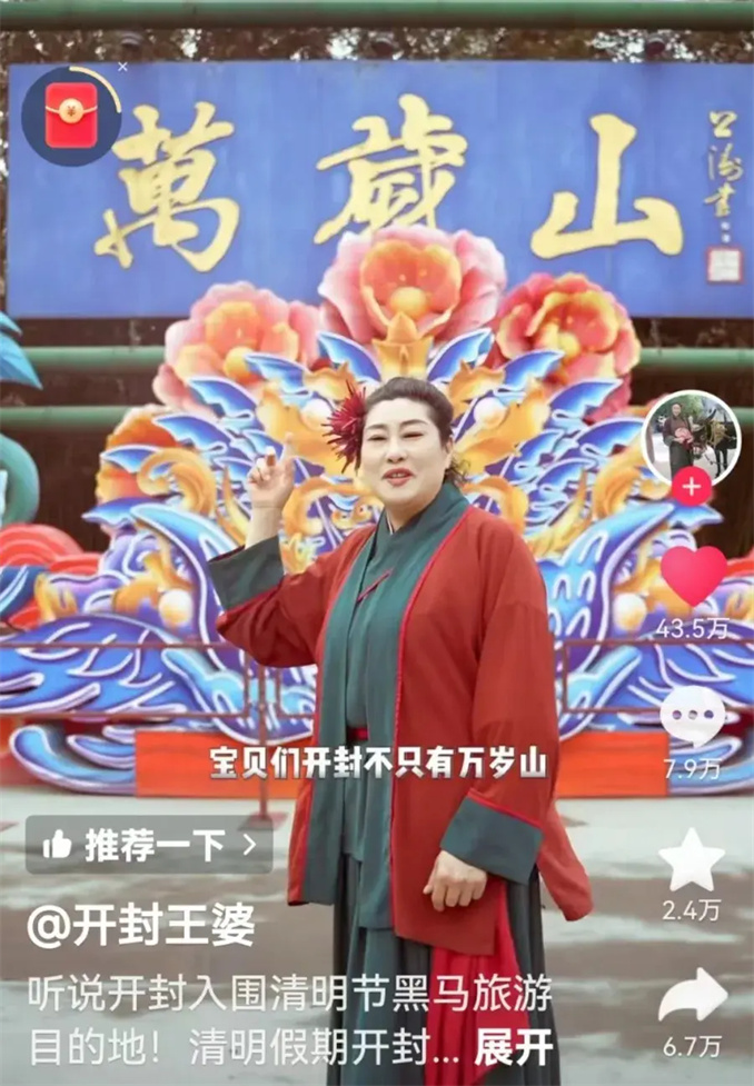 今年3月,河南開封萬歲山景區(qū)相親節(jié)目“王婆說媒”走紅網絡,節(jié)目中的“王婆”扮演者趙梅,在抖音平臺迅速漲粉數百萬。