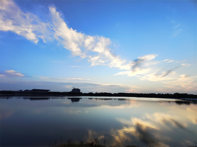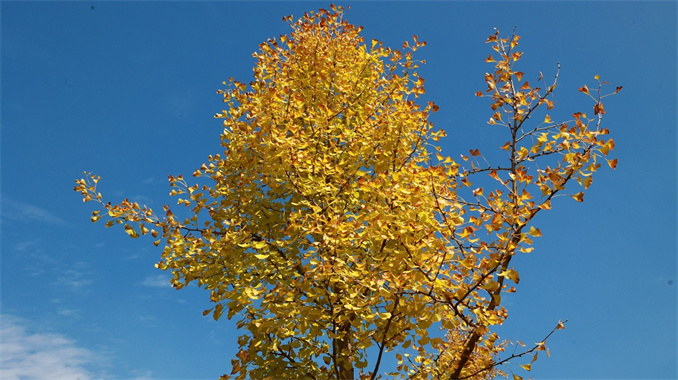 周口市鄲城縣人民公園,天藍(lán)云舒,湖水清澈平靜,樹木五彩繽紛,共同組成了絢麗多姿的秋日美景。