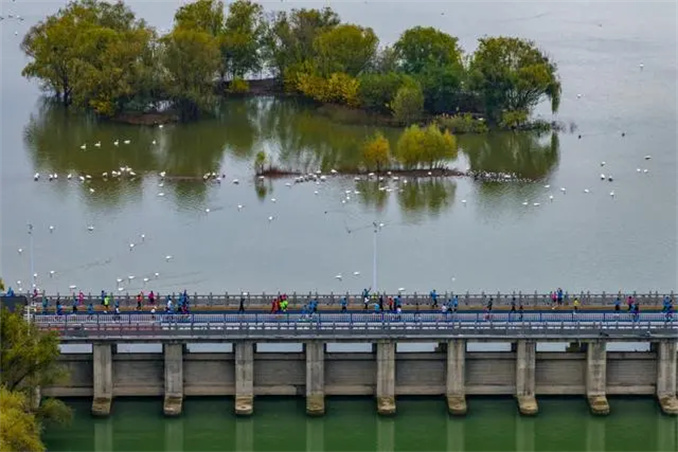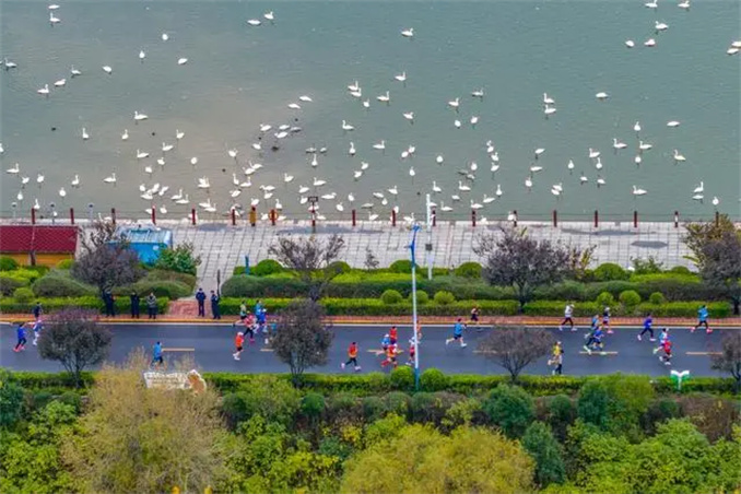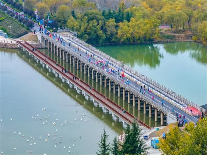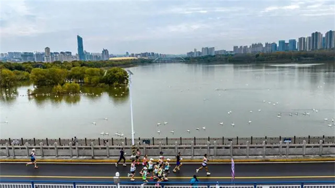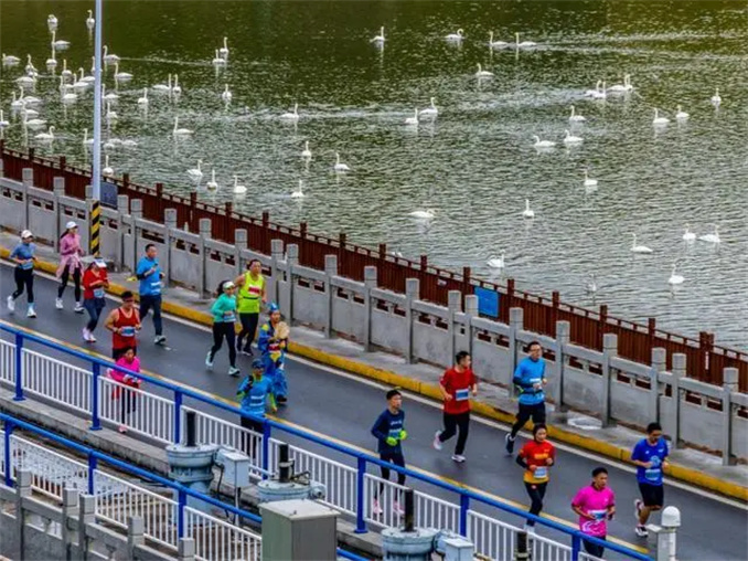賽道穿越三門峽天鵝湖國家城市濕地公園,參賽者們仿佛置身于一幅人與自然和諧共生的美麗畫卷。正值白天鵝來三門峽越冬之際,馬拉松與“天鵝季”不期而遇,為比賽增添了一份別樣的韻味。