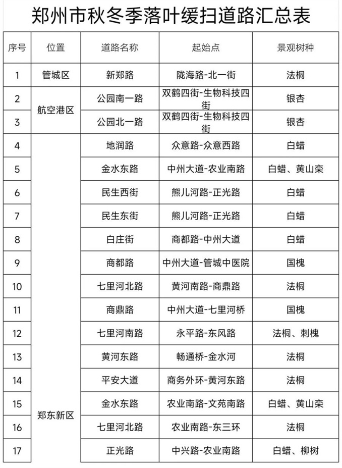在不影響市民出行和安全的前提下,鄭州市城管局結(jié)合景觀彩葉樹種和周邊環(huán)境,在市區(qū)選定金水東路(農(nóng)業(yè)南路至文苑南路)、楓香街(紅松路至創(chuàng)新大道)等45條道路路段,在樹葉脫落成景時(shí)實(shí)施落葉緩掃,最大限度保留自然景觀,為市民留住更多“秋彩”記憶。