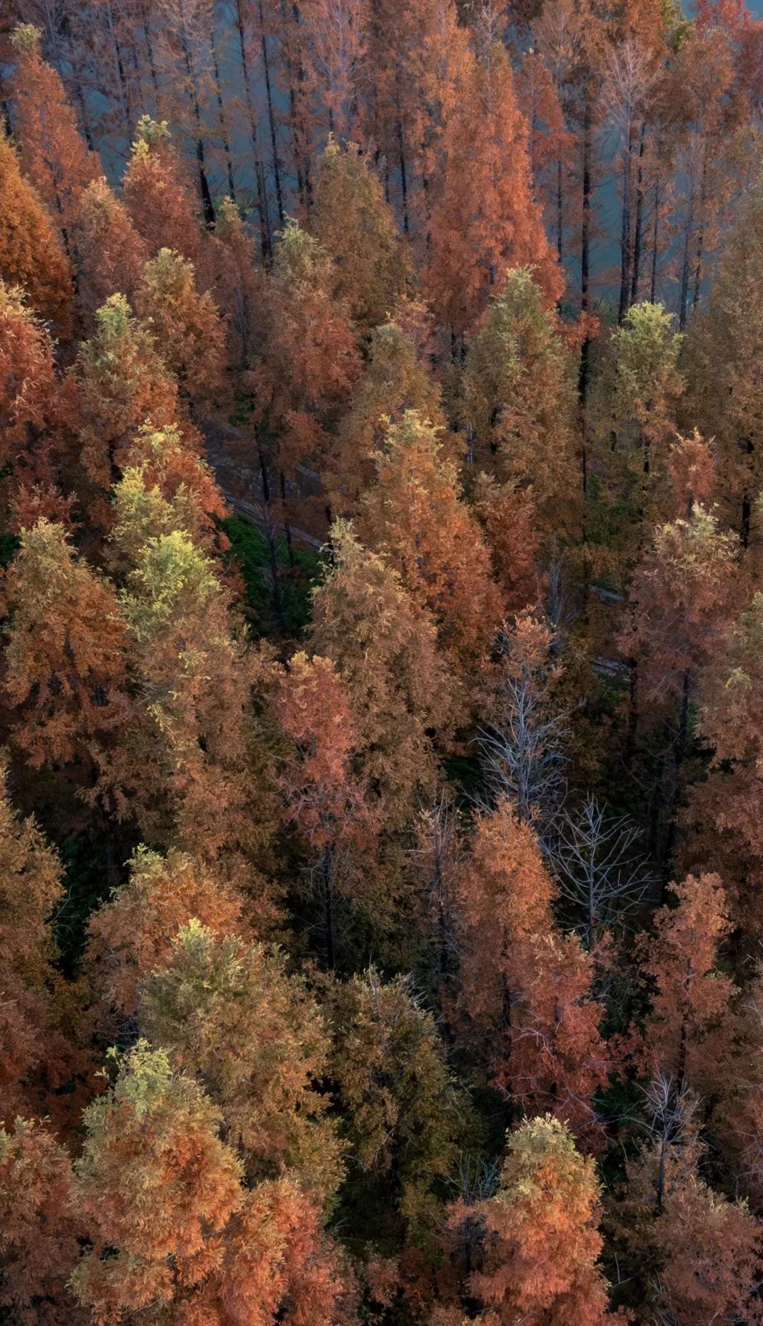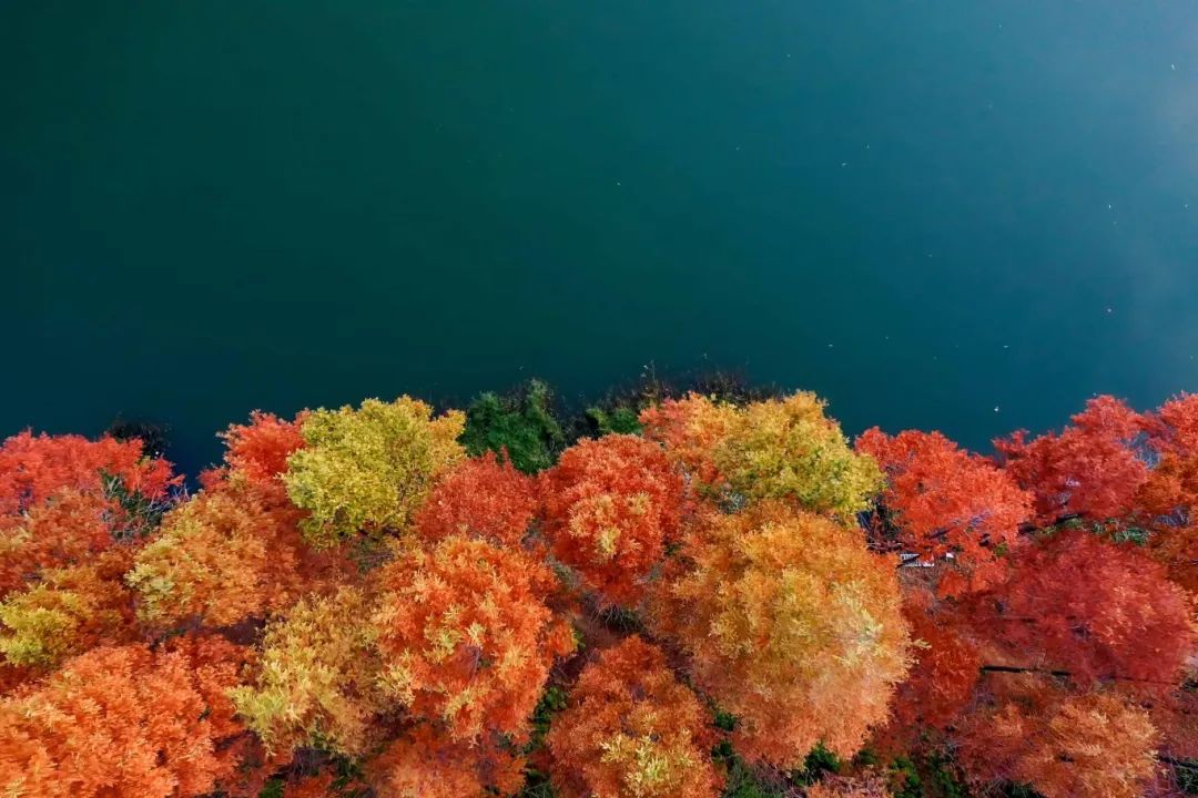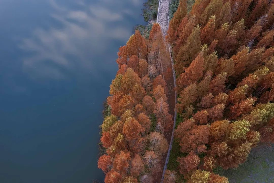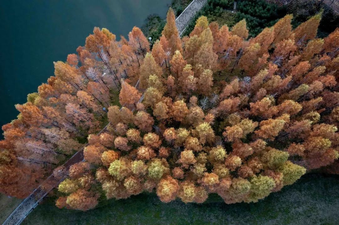 郁郁蔥蔥的紅杉在入冬之后逐漸紅了,組成別具一格的景色,整齊的池杉構(gòu)成一幅層林盡染的畫卷。