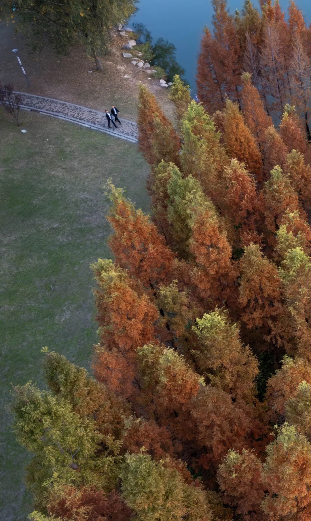 初冬的鄭州新鄭,隨著季節(jié)的輪轉(zhuǎn)層林盡染,一棵棵紅杉樹漸次變紅,黃、橘、紅相互交織,整齊又挺拔,蔚為壯觀且驚艷,遠(yuǎn)遠(yuǎn)望去,猶如一幅渾然天成的彩色油畫。