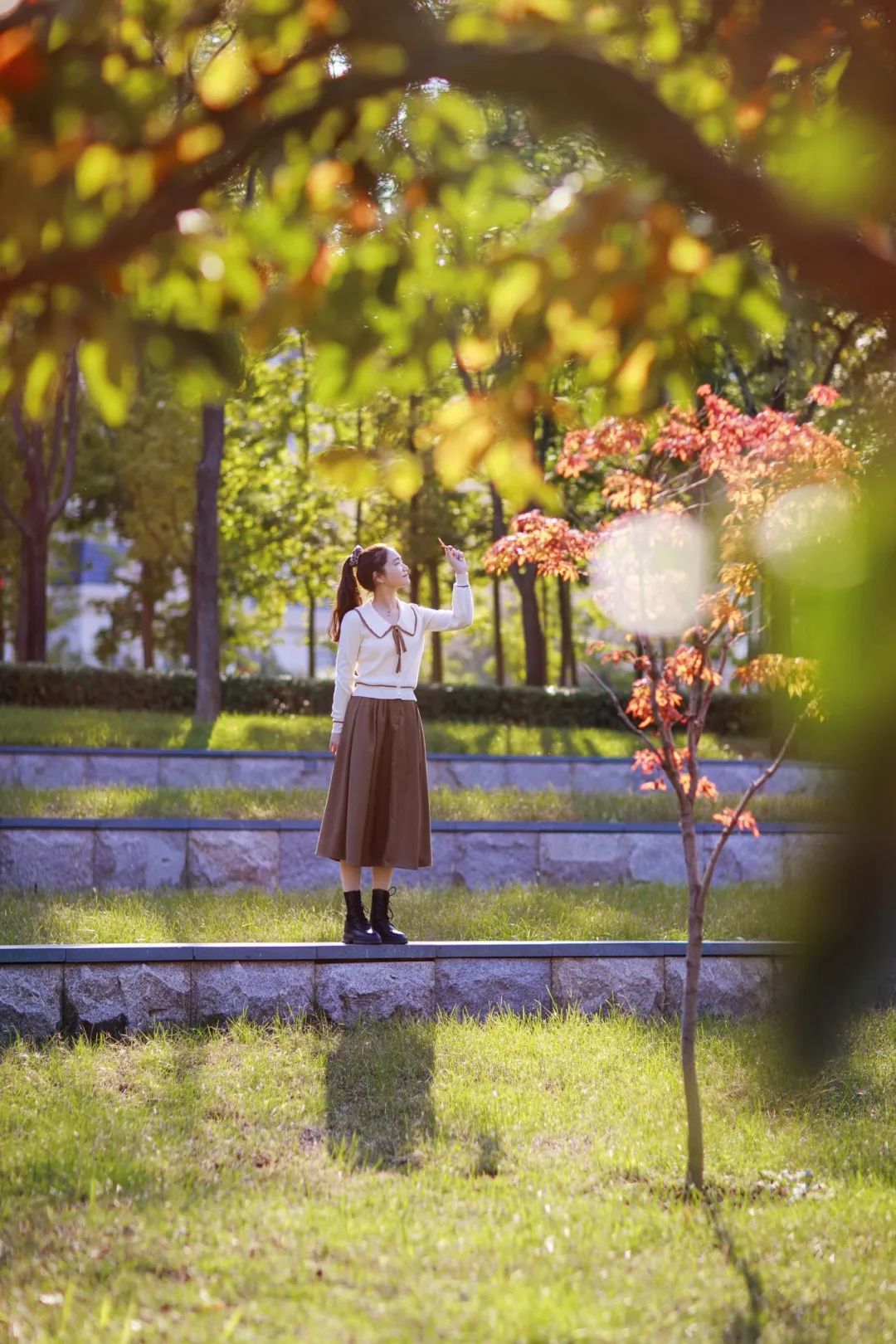 一排排筆直挺拔的紅杉樹,淺紅、深紅、金紅相應(yīng)交織,一起在藍(lán)天的映襯下,濃淡相宜,亦詩亦畫。