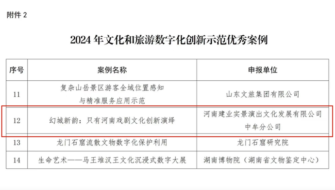 近日,文化和旅游部公布了2024年文化和旅游數(shù)字化創(chuàng)新示范“十佳案例”和“優(yōu)秀案例”名單,建業(yè)文旅旗下只有河南·戲劇幻城的“幻城新韻:只有河南戲劇文化創(chuàng)新演繹”案例成功入選2024年文化和旅游數(shù)字化創(chuàng)新示范優(yōu)秀案例。